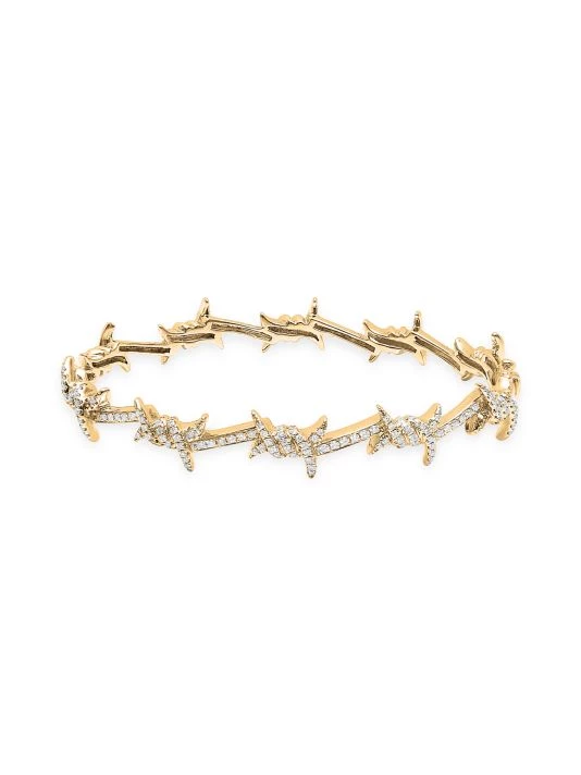 Featuring a barbed-wire-inspired silhouette, DJULA’s 18K-yellow-gold Barbelé bangle shimmers with pavé diamonds. This edgy accessory is from the Parisian label’s Homme Collection, a tribute to audacious and bold urban men.