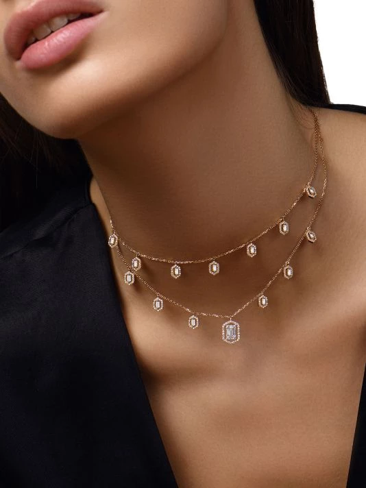 From the Eclat Collection. Signature illusion-suspended diamonds dangle from this delicate architecturally-inspired choker.