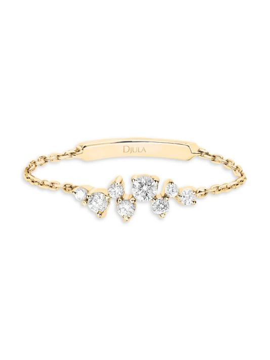 Handcrafted of 18K yellow gold, this delicate DJULA ring features a row of scattered round white diamonds joined to a slender cable chain. This piece is from the Parisian label’s Fairytale Collection, a line of exquisite jewelry distinguished by its modern silhouettes and geometric motifs.