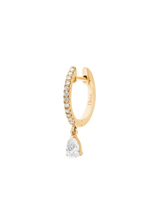 From the Glam Rock Collection. A petite huggie hoop earring, symbolizing strength and freedom, suspends a single glittering pear-shaped diamond.