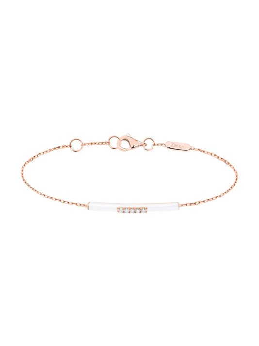 Crafted of 14K rose gold, DJULA’s bracelet features a slender white enamel bar charm accented with five shimmering white diamonds. This piece is from the French label’s Marbella Collection, a line of delicate jewelry that pairs vibrant enamel with precious gemstones and metals for a bright, colorful effect.