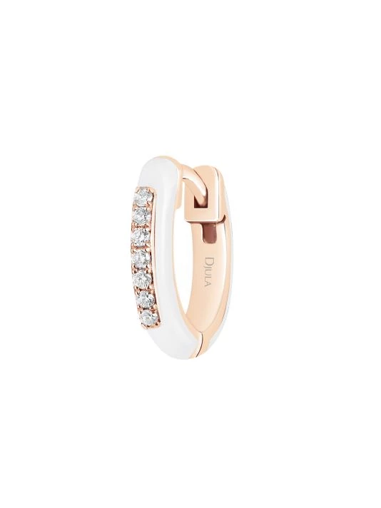 Made of 14K rose gold and white enamel, DJULA’s elegant huggie hoop earring is embellished with seven sparkling white diamonds. This piece is from the French label’s Marbella Collection, a line of delicate jewelry that pairs vibrant enamel with precious gemstones and metals for a bright, colorful effect.