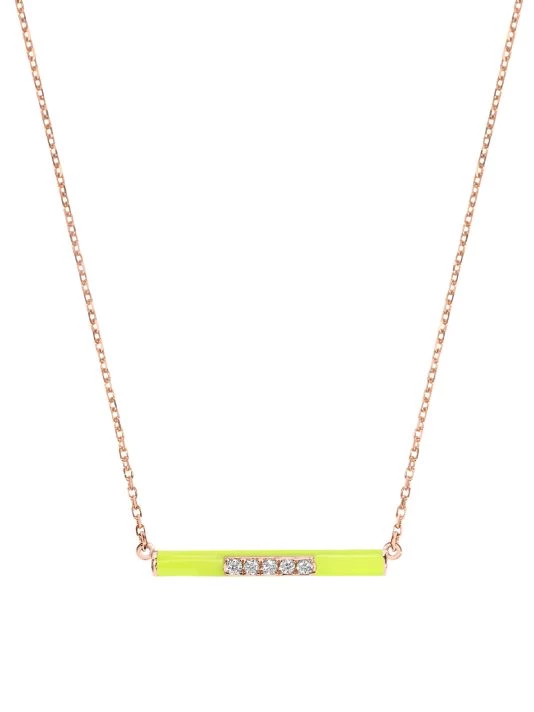 Crafted of 14K rose gold, DJULA’s necklace features a slender yellow enamel bar pendant accented with five shimmering white diamonds. This piece is from the French label’s Marbella Collection, a line of delicate jewelry that pairs vibrant enamel with precious gemstones and metals for a bright, colorful effect.