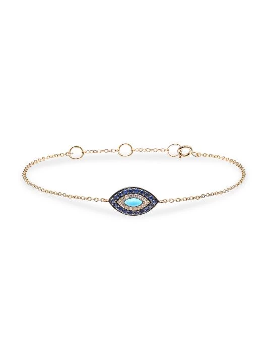 From the Marbella Collection. Crafted of 14K yellow gold, this elegant bracelet features an evil eye charm embellished with blue and white diamonds and a luminous turquoise cabochon.