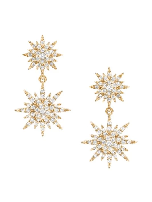 From the Soleil Collection. Inspired by the grandeur of Louis XIV, these radiant drop earrings feature diamond pavé covering dual stylized suns.