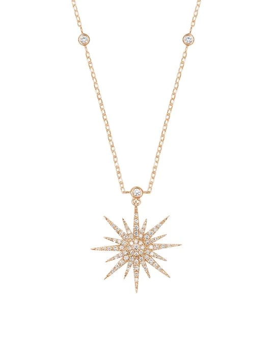 From the Soleil Collection. Tiny round diamonds dot the chain of this pendant necklace, inspired by the grandeur of Louis XIV, with a stylized sun.